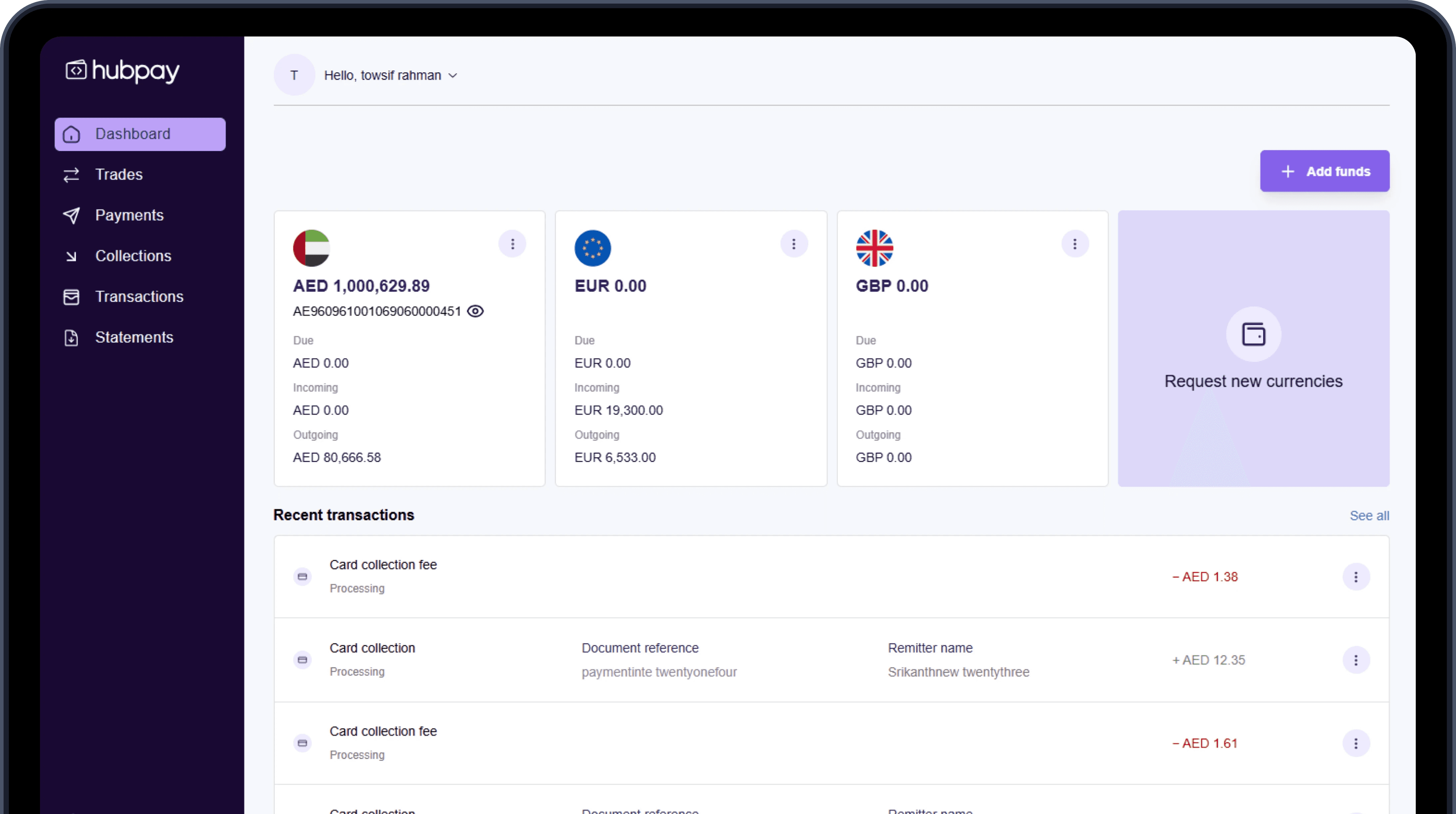 You can hold and convert 150+ currencies, including AED, USD, EUR, GBP, JPY, and more. Hubpay also provides named virtual IBANs in major global currencies.