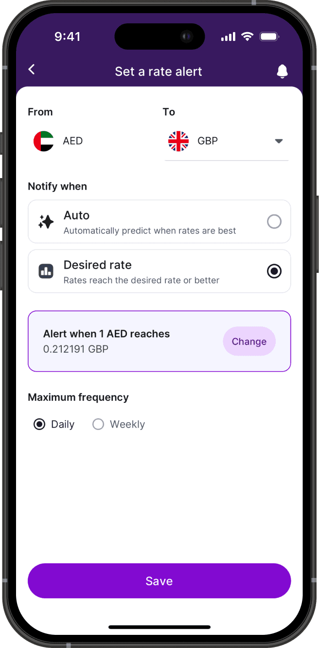 Get notified when your rate is live or when it's the best time to send!